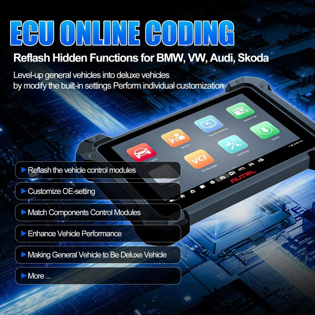 【FLERE SKJULTE OG GUIDEDE FUNKTIONER 2.0】Vil du forbedre dit køretøjs ydeevne? Autel MaxiCOM MK908 II bilscanner kan fungere på VW/Audi/Škoda/Seat/Man LD/Bentley for at aktivere skjulte funktioner såsom åbning af vinduesløft med ét klik og spejlfoldning for at hjælpe dig med at forbedre bilens ydeevne. De guidede funktioner giver trinvise instruktioner, viser testkrav, nødvendige værktøjer og advarselstips, der hjælper dig med at afslutte dit arbejde lettere, kompatibel med VW/Audi/Škoda/Seat.