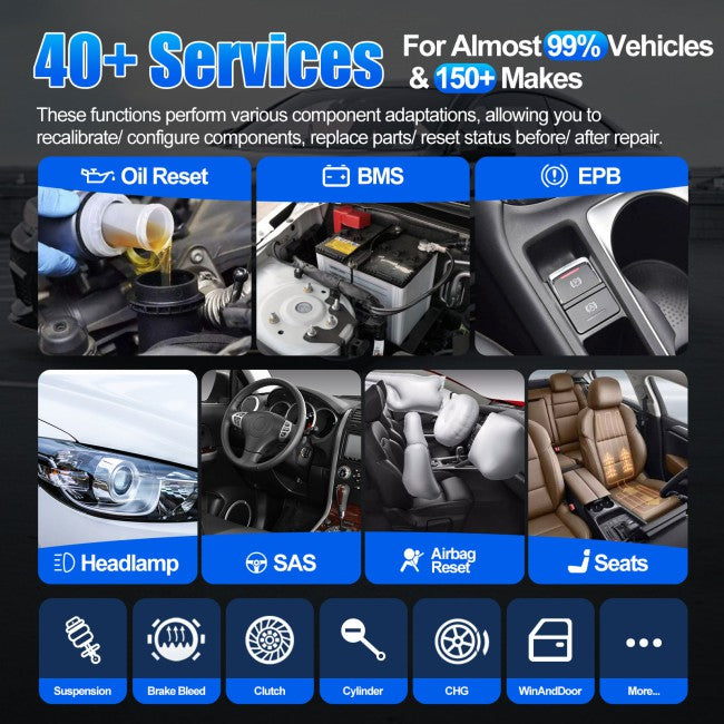 【38+ SERVICE FUNKTIONER】Autel MK908 II scanningsværktøjet dækker 38+ tjenester som olienulstilling, EPB, SAS-kalibrering, SRS, batteriregistrering, gasspjældsnulstilling, ABS-udluftning, injektorkodning, gearskiftetilpasning, affjedringskalibrering, kalibrering af vægtsensorer, effektbalance, indlæring af krumtapakslens variation osv.