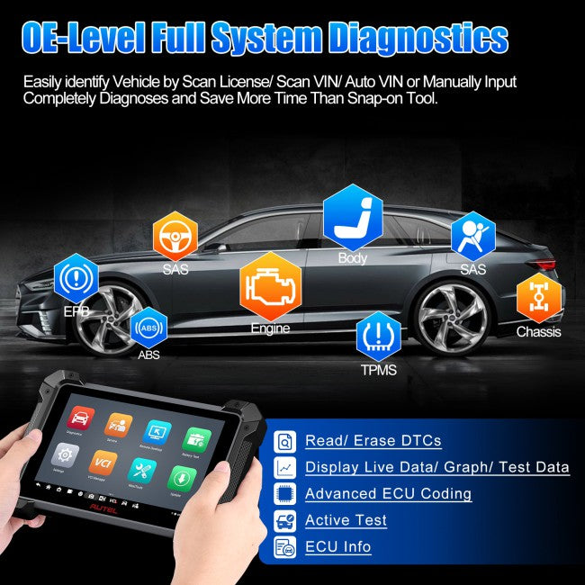 【OE-NIVEAU ALLE MODULER DIAGNOSTIK】 Autel MK908 II professionelt scanningsværktøj kan få adgang til og diagnosticere alle tilgængelige moduler (PCM, ECM, EPS, PDM, TPM, BCM, ABS osv.) på over 80 amerikanske indenlandske, europæiske og asiatiske mærker og modeller frem til 2025. Med komplette funktioner til koder, live data, aktive test, ECU-information, matchning osv. kan Autel MK908 II autoscannings værktøjet læse og rydde diagnostiske fejlkoder (DTC'er), vise live datastrøm fra flere sensorer og udføre køretøjs specifikke aktive test.