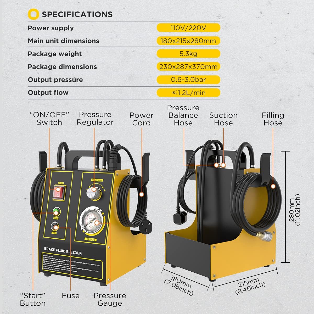 • Det er ikke nødvendigt at tilslutte en luftkompressor. AUTOOL AST605 Automotive Brake Fluid Bleeder leveres med en indbygget arbejds trykpumpe. Bremsevæske kan udskiftes ved blot at tilslutte 110V/220V strømforsyning.