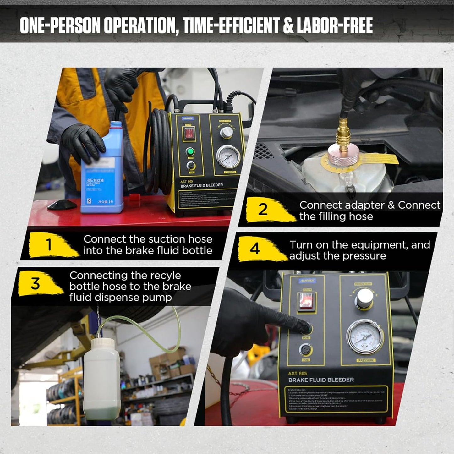• Bilbremse væskeudlufter kan betjenes af én person, fire hjuls olie kan udskiftes sammen. Fire pumper, der udskifter olie samtidigt, kan spare tid og arbejde.