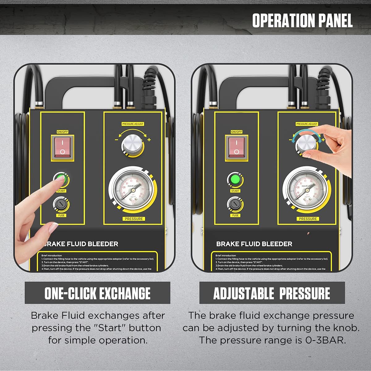• Bremse væske udvekslingstrykket kan justeres ved at dreje på knappen. Trykområdet er O-3BAR.