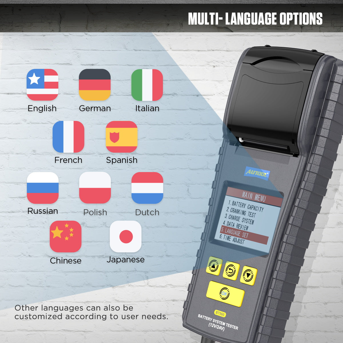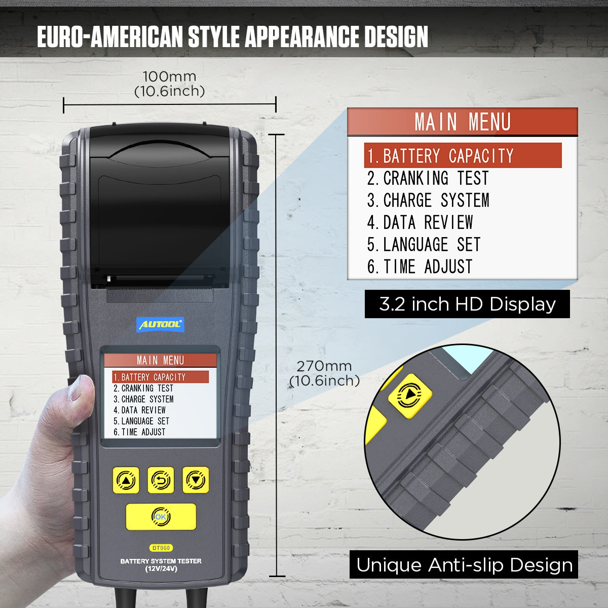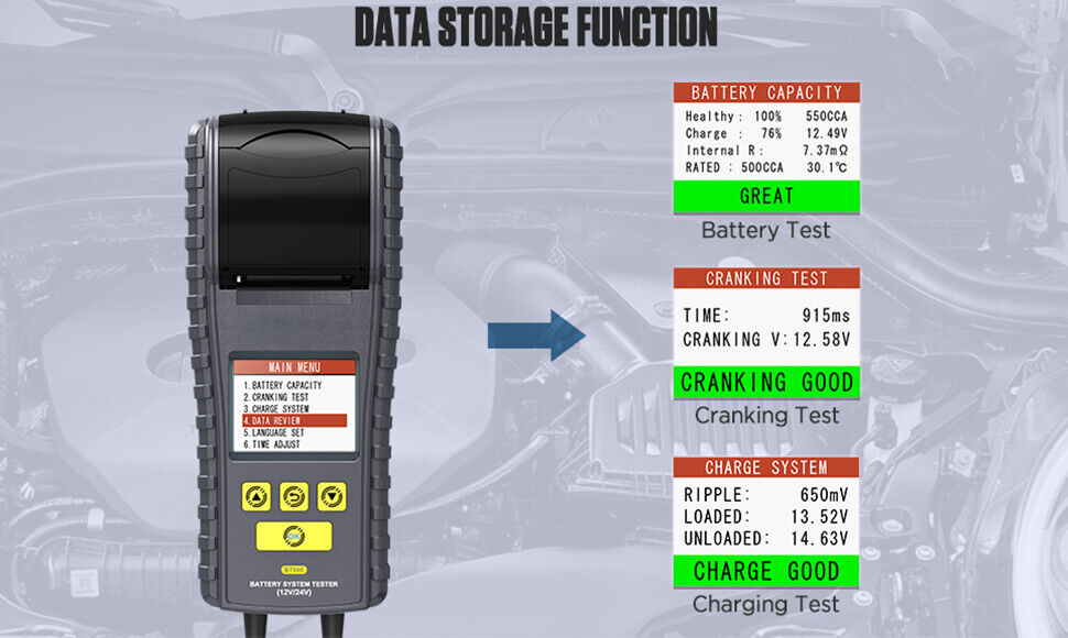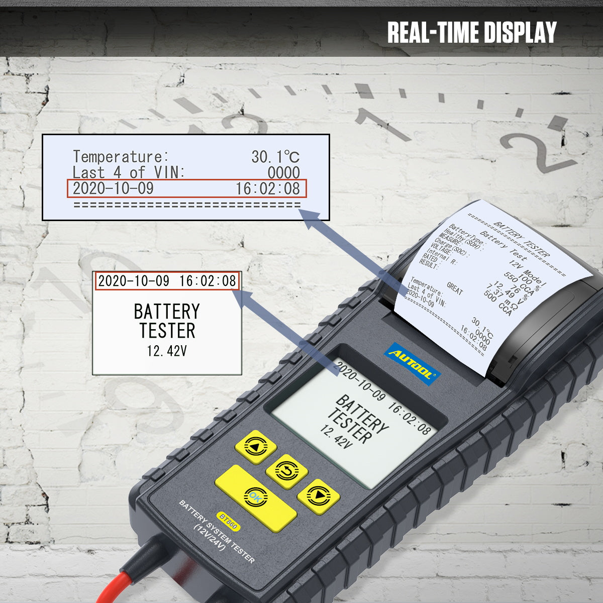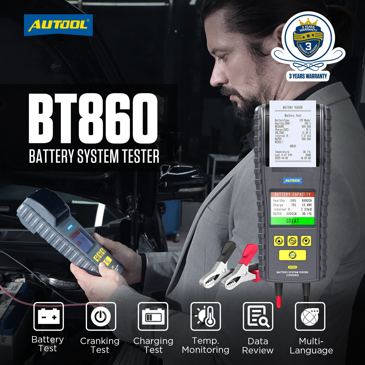 AUTOOL BT860 som AUTOOL nyudgav en bil batteri tester, den er designet med farveskærm og nem printer for bedre brugsoplevelse. Denne batteri tester er med temperatur overvågning i realtid, omvendt polaritets beskyttelse og indbygget termisk printer osv., som er i stand til at bestemme den nøjagtige grad af temperatur påvirkning på batteriets ydeevne.