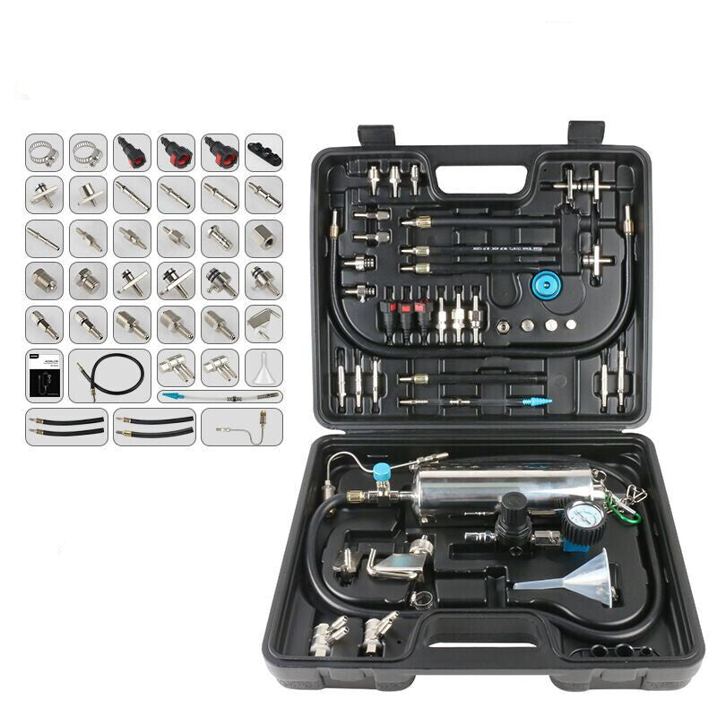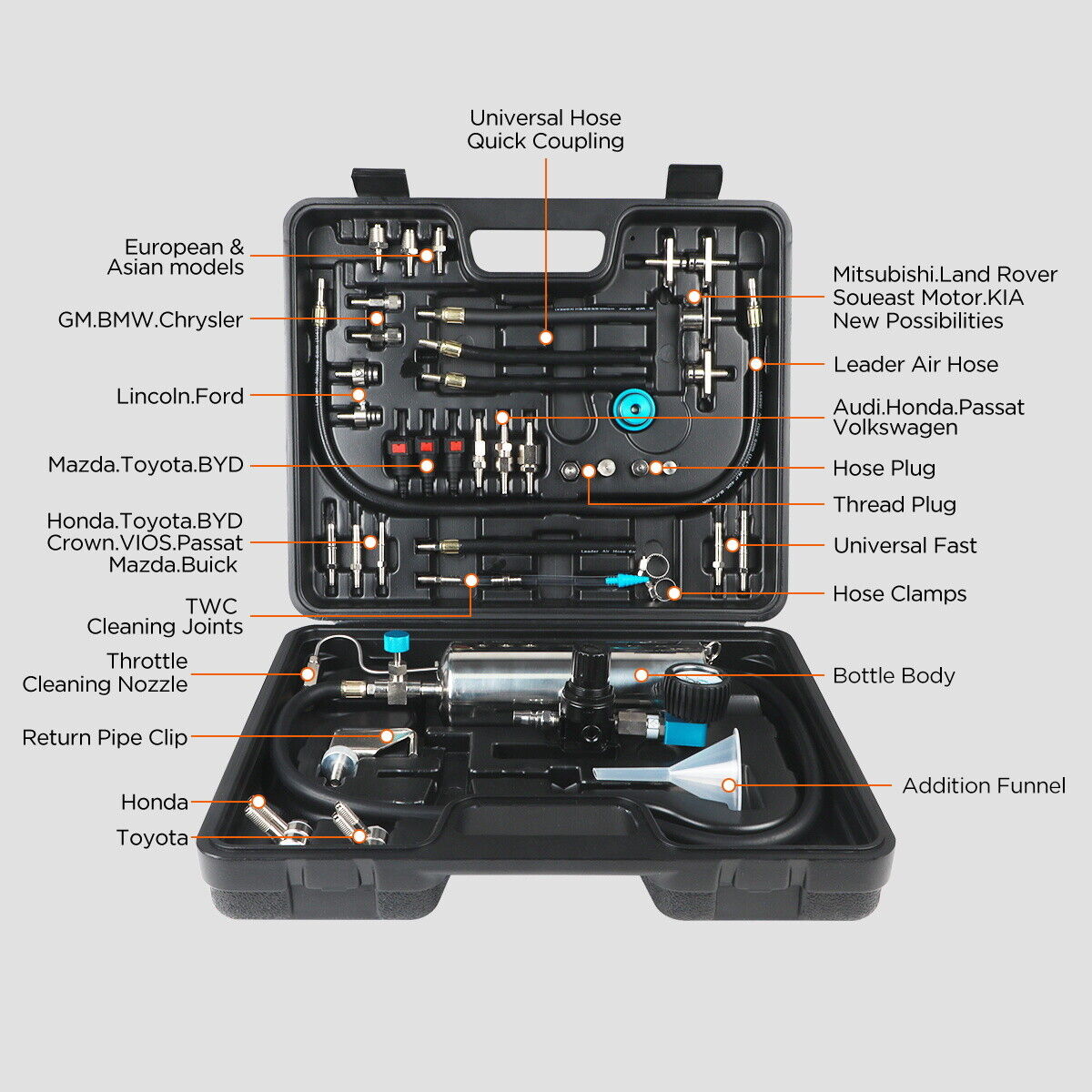 Injektor rensesættene inkluderer mange forskellige slags adaptere, dækker næsten alle biler og lette lastbiler i EU, Asien, USA. Ikke-afmonteret injektor Gasspjæld og brændstof system.