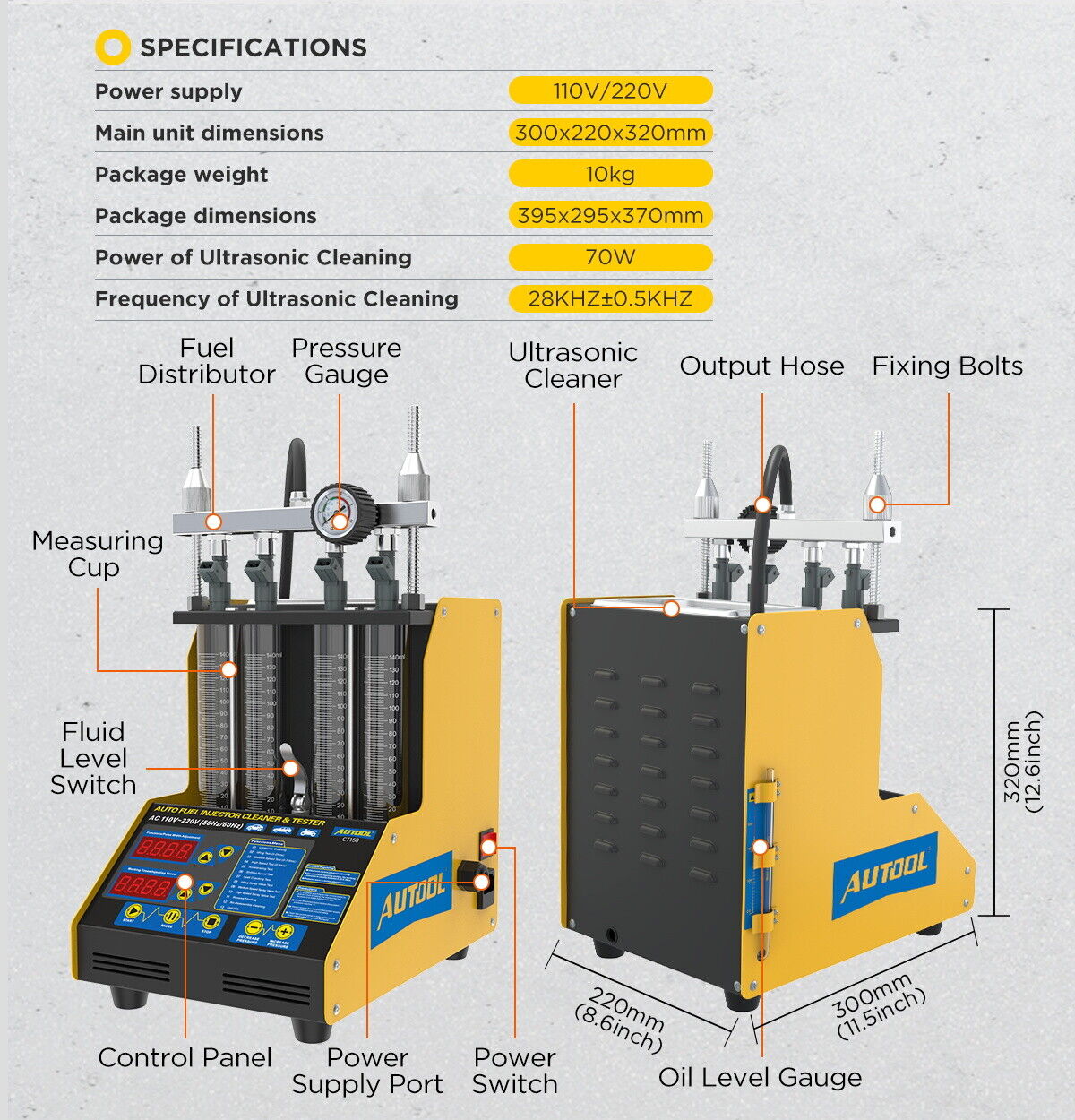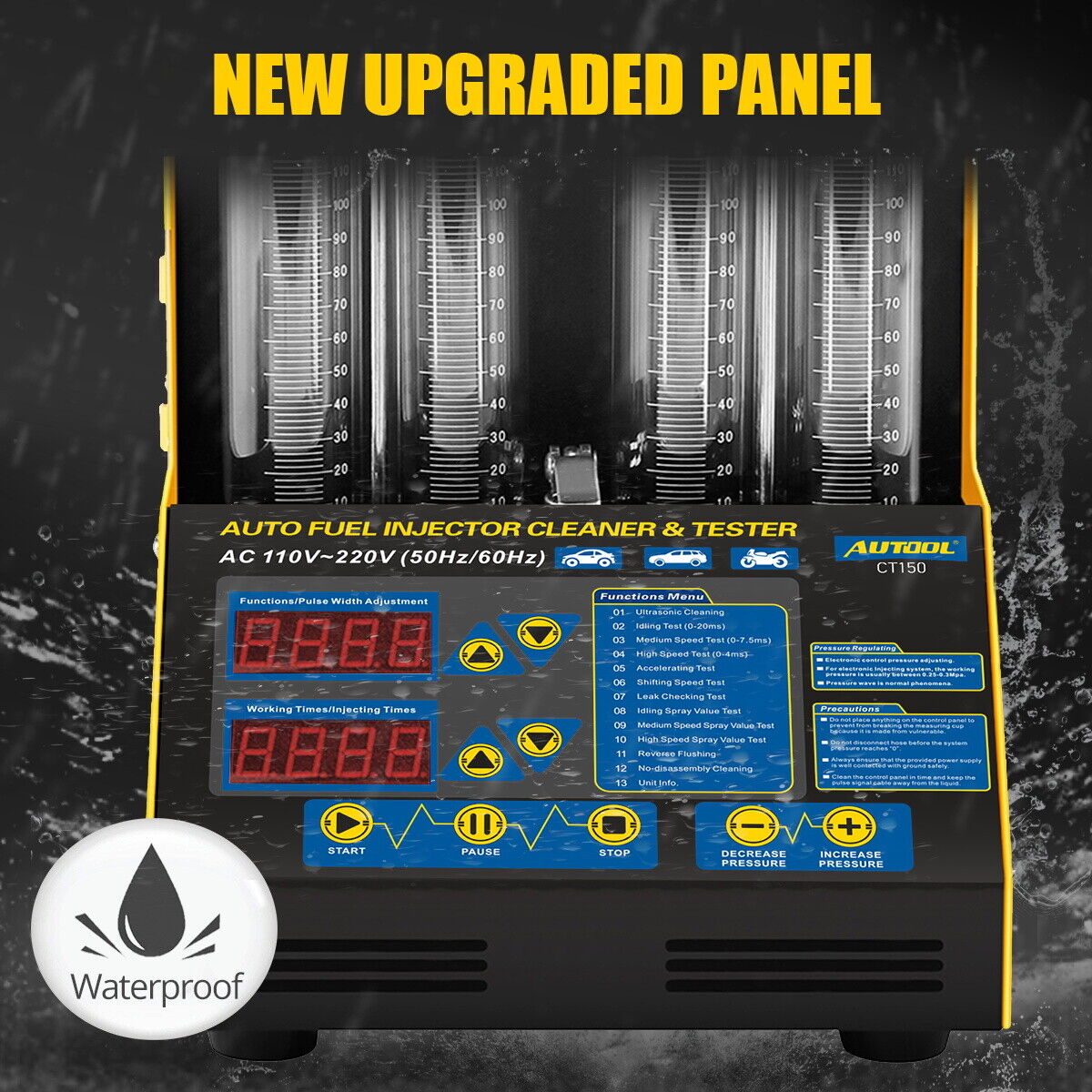AUTOOL CT150 Fuel Injector Tester & Cleaner er en professionel 4 cylindret auto brændstofinjektor test rengøringsmaskine. CT150 Fuel Injector Cleaner Tester hjælper os med at rense og teste brændstofinjektorerne på de fleste benzinbiler og motorcykler.