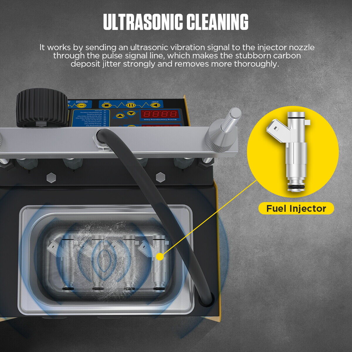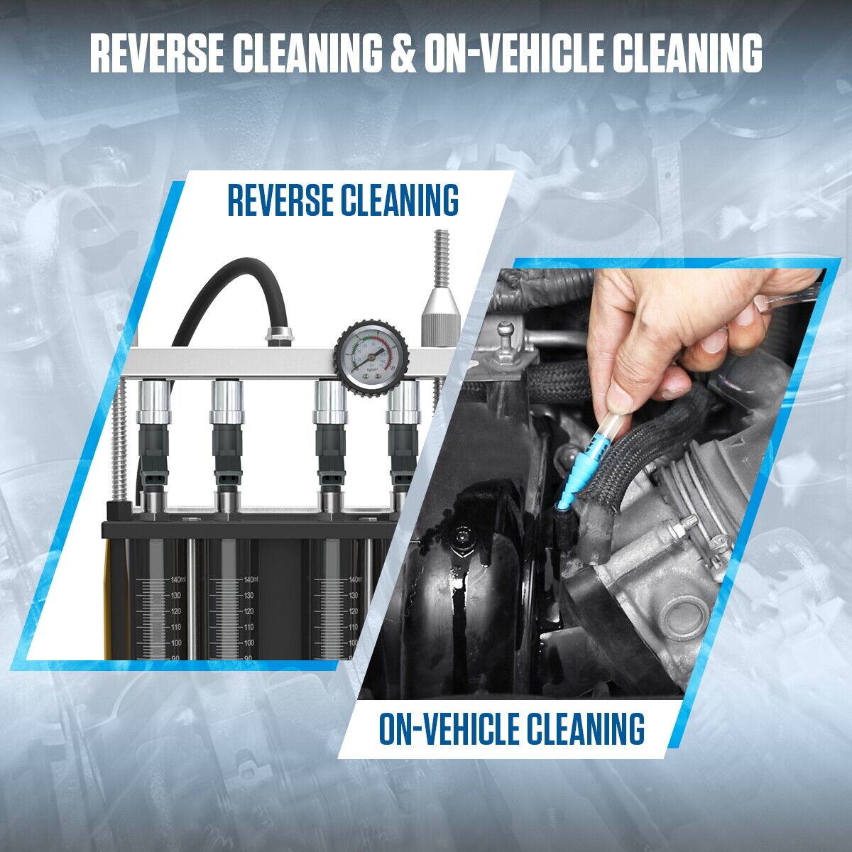 4 injektorer kan testes og rengøres på én gang. Understøtter omvendt rengøring og rengøring i køretøjet. Plus, det kan også bruges på 6 cylindre, to gange test vil gøre.
