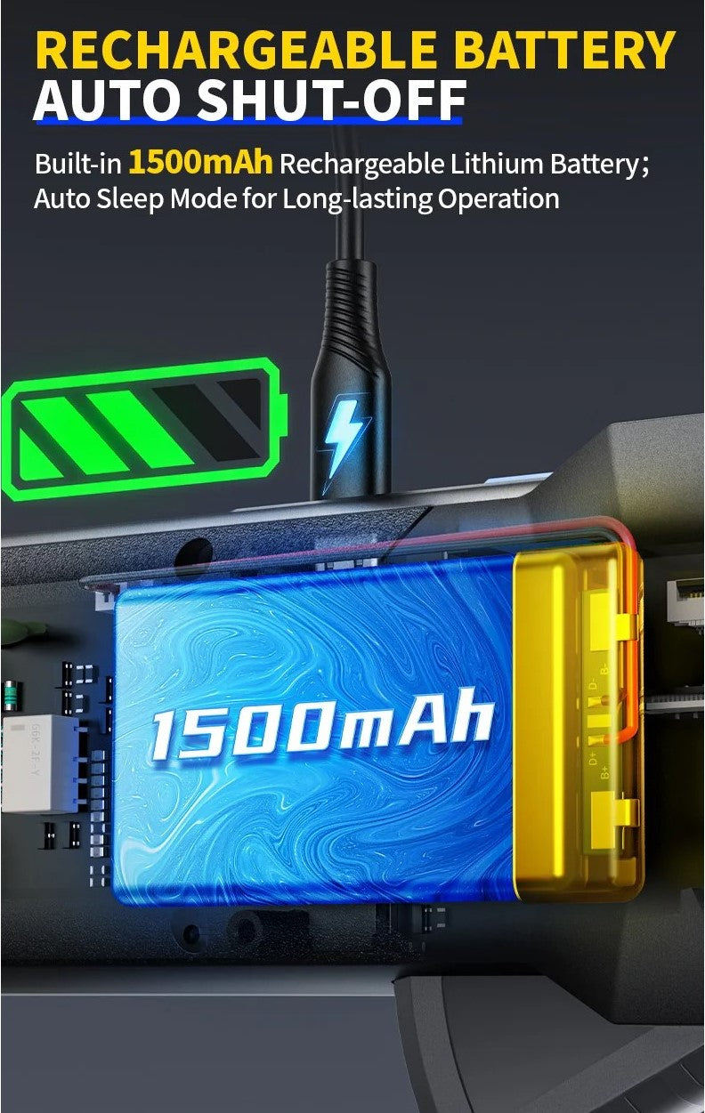 Pålidelig strøm og effektivitet: Drevet af et langtidsholdbart 3,7V 1500mAh batteri med intelligent automatisk sluk for at forlænge batteriets levetid.