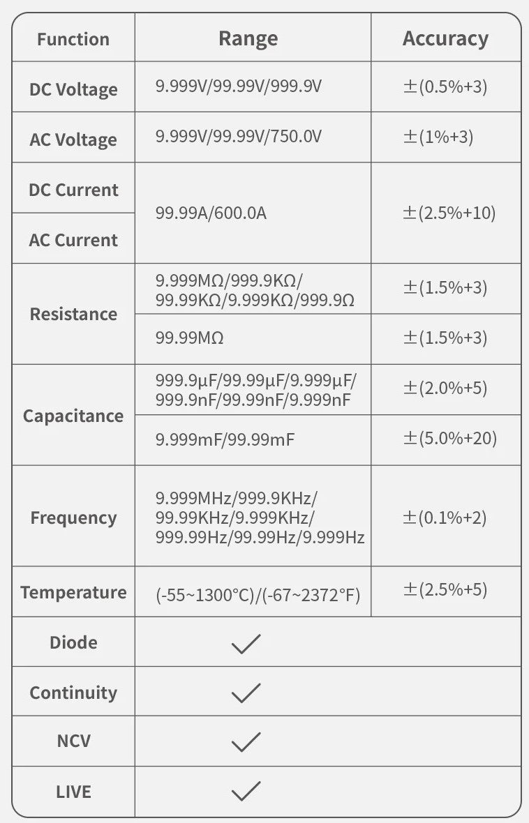 Måling med høj præcision og bred rækkevidde: Tilbyder 10.000 tæller True RMS med understøttelse af op til 750V spænding og 600A strøm, hvilket gør den velegnet til forskellige applikationer.