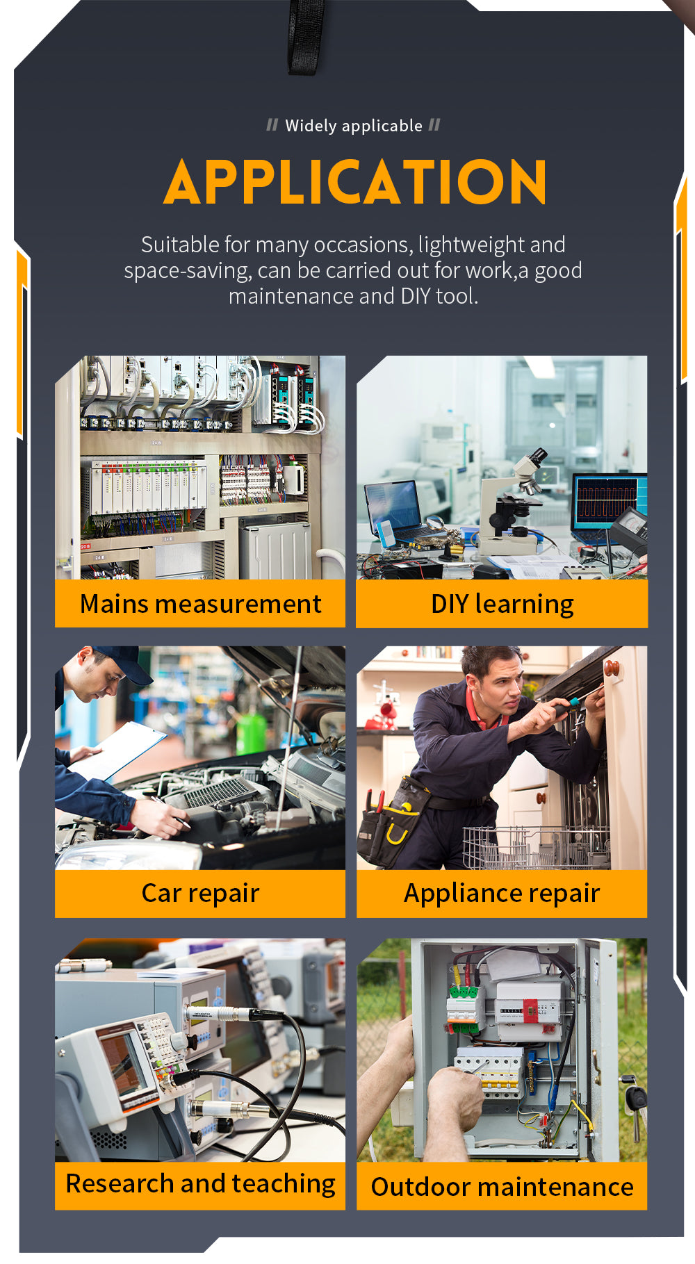 【Bred applikationer】: Intelligent anti-brænding, anvendelig til en række forskellige lejligheder, velegnet til brugsmålinger, gør-det-selv-læring, bil reparation, reparation af husholdnings apparater, forskning og undervisning, udendørs vedligeholdelse osv.