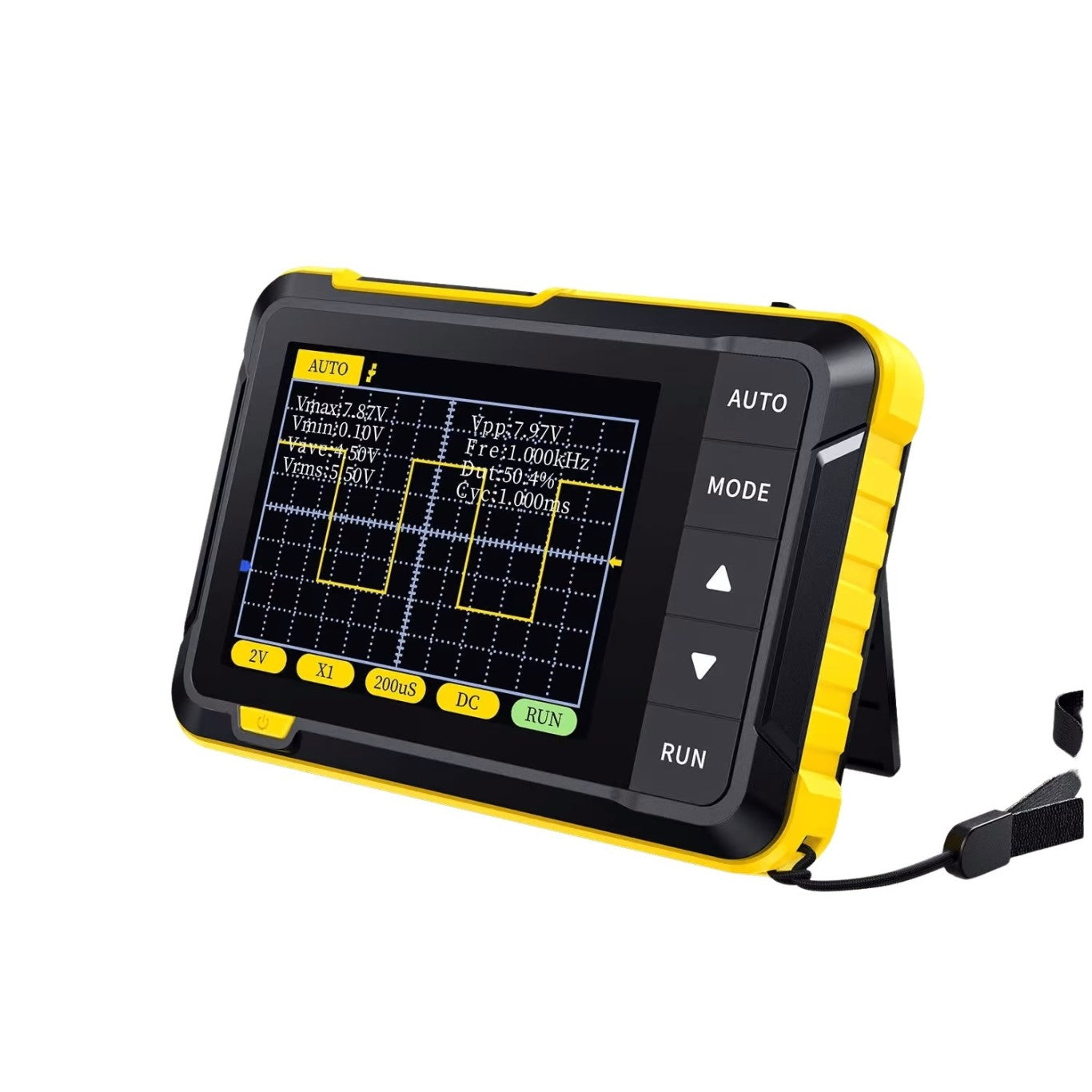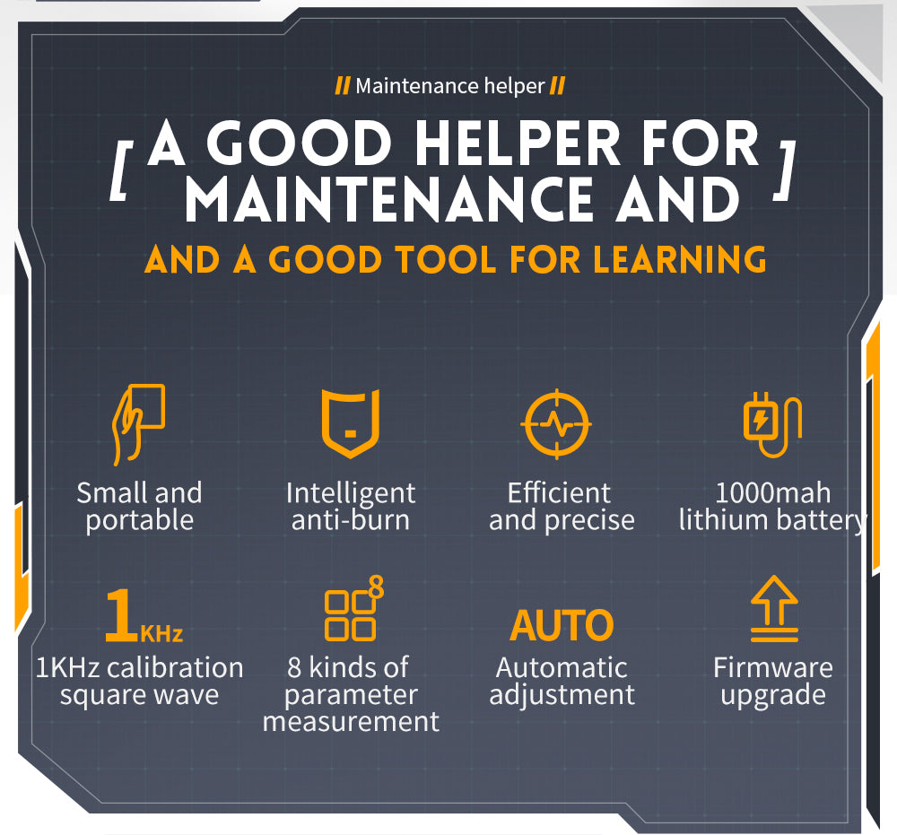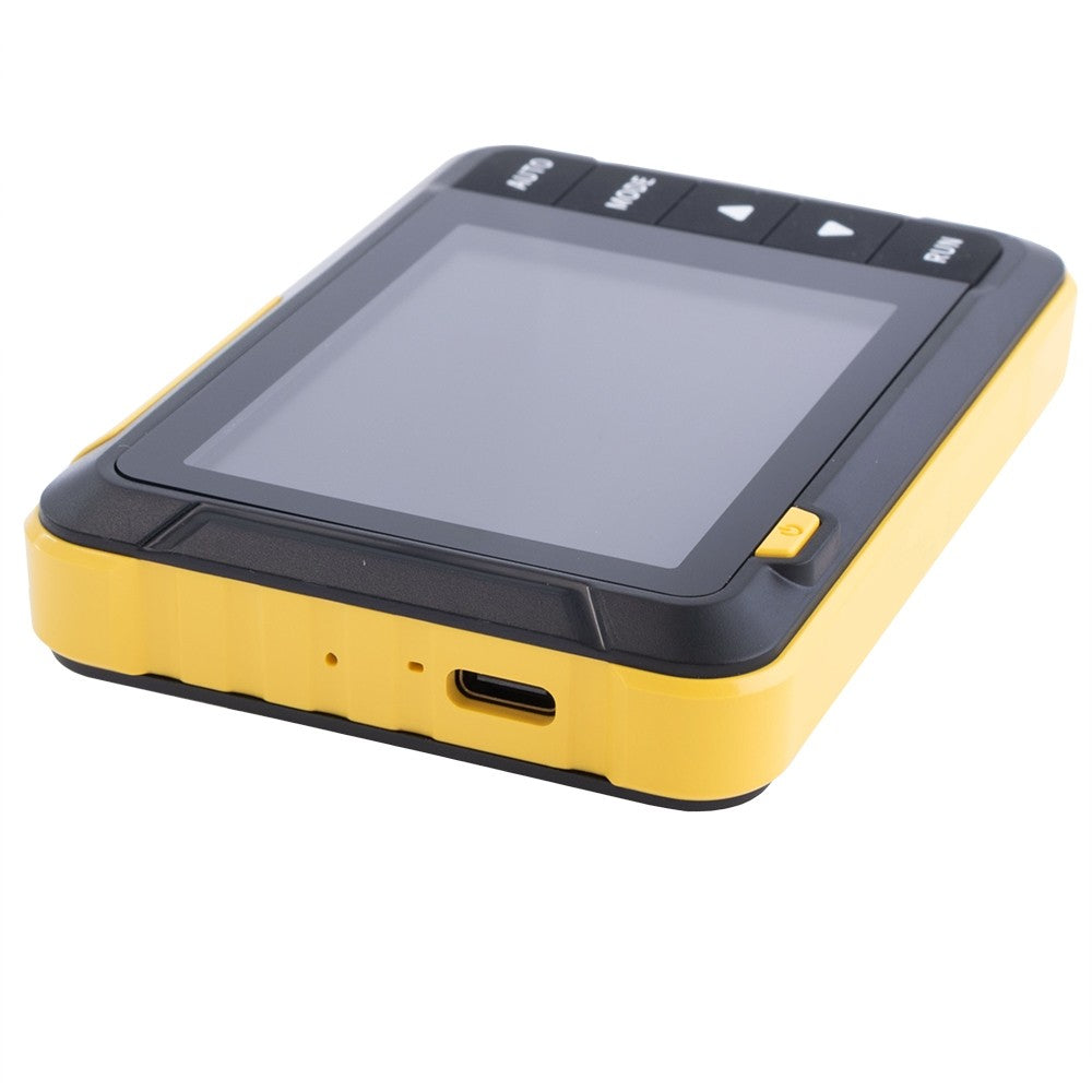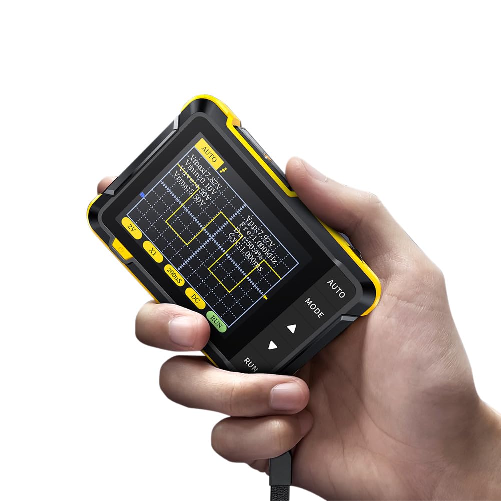 Dette digitale oscilloskop er kompakt i størrelsen, med 2,8 tommer farvedisplay, med en samplings hastighed i realtid på 2,5 MS/s, 200 kHz båndbredde, med komplette trigger funktioner (enkelt, normal, automatisk), både til periodiske analoge signaler eller ikke- periodiske digitale signaler kan frit bruges, understøtter skift mellem stigende-kant-trigger-tilstand og faldende-edge-trigger-tilstand, understøtter op til ±400V spændingssignalmåling. Med bølgeformmålingsdisplay, en række bølgeformmålinger for at imødekomme dine daglige behov. Med en 1KHz kalibrering SQW, en-knaps automatisk justering og med Type-C port understøtter firmwareopgradering og opladning. Velegnet til brugsmålinger, DIY-læring, bilreparation, reparation af husholdningsapparater, forskning og undervisning, udendørs vedligeholdelse osv.