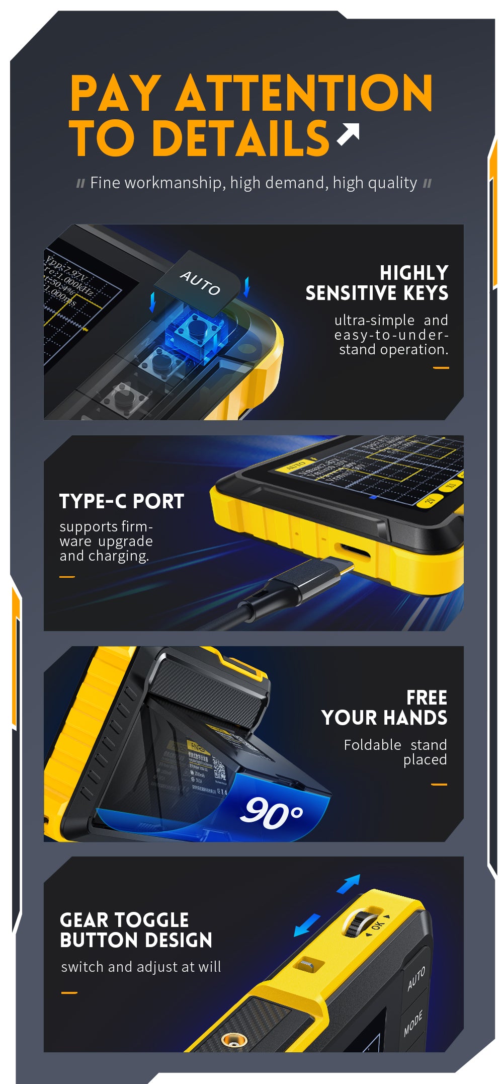 【Effektiv og nøjagtig】: Måling af flere parametre, oscilloskopet har en samplingshastighed i realtid på 2,5 MS/s, 200 kHz båndbredde, med komplette triggerfunktioner (enkelt, normal, automatisk), både for periodiske analoge signaler eller ikke-periodiske digitale signaler signaler kan frit bruges, understøtter skift mellem stigende-kant-trigger-tilstand og faldende-edge-trigger-tilstand, understøtter op til ± 400V spændingssignalmåling.