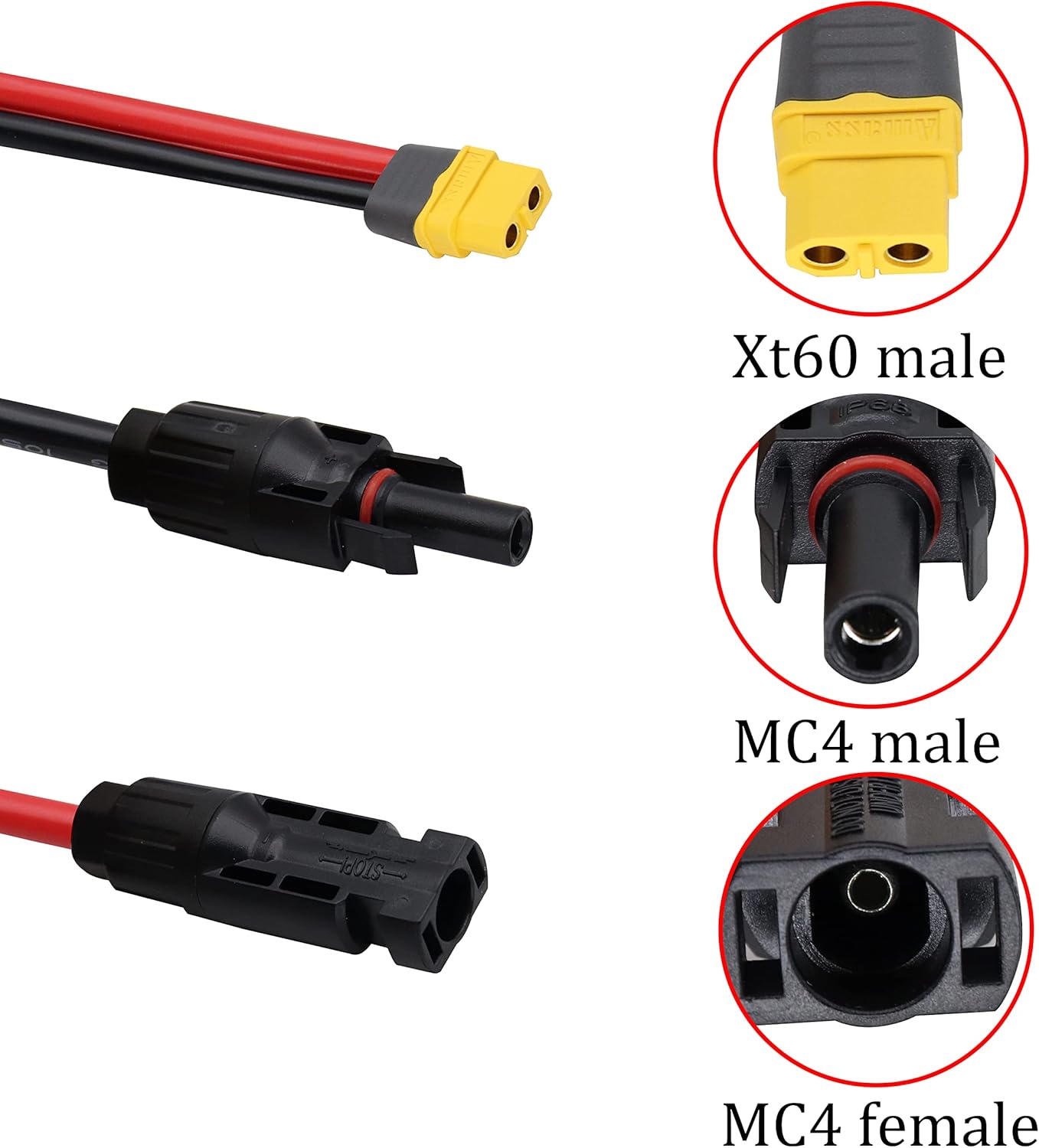 • 3. Bred kompatibilitet: Dette Solar XT60 adapterkabel er perfekt til en række applikationer, herunder bærbare kraftværker, lithium batteripakker, solgeneratorer og foldbare solpaneler. Den er specielt designet til kompatibilitet med Goal Zero Yeti, Jackery solgeneratorer, Suaoki, Renogy 400WH og EnerPlex solenergistationer samt elektriske køretøjer, UPS-batterier, batterier, golfvogne og gaffeltrucks.