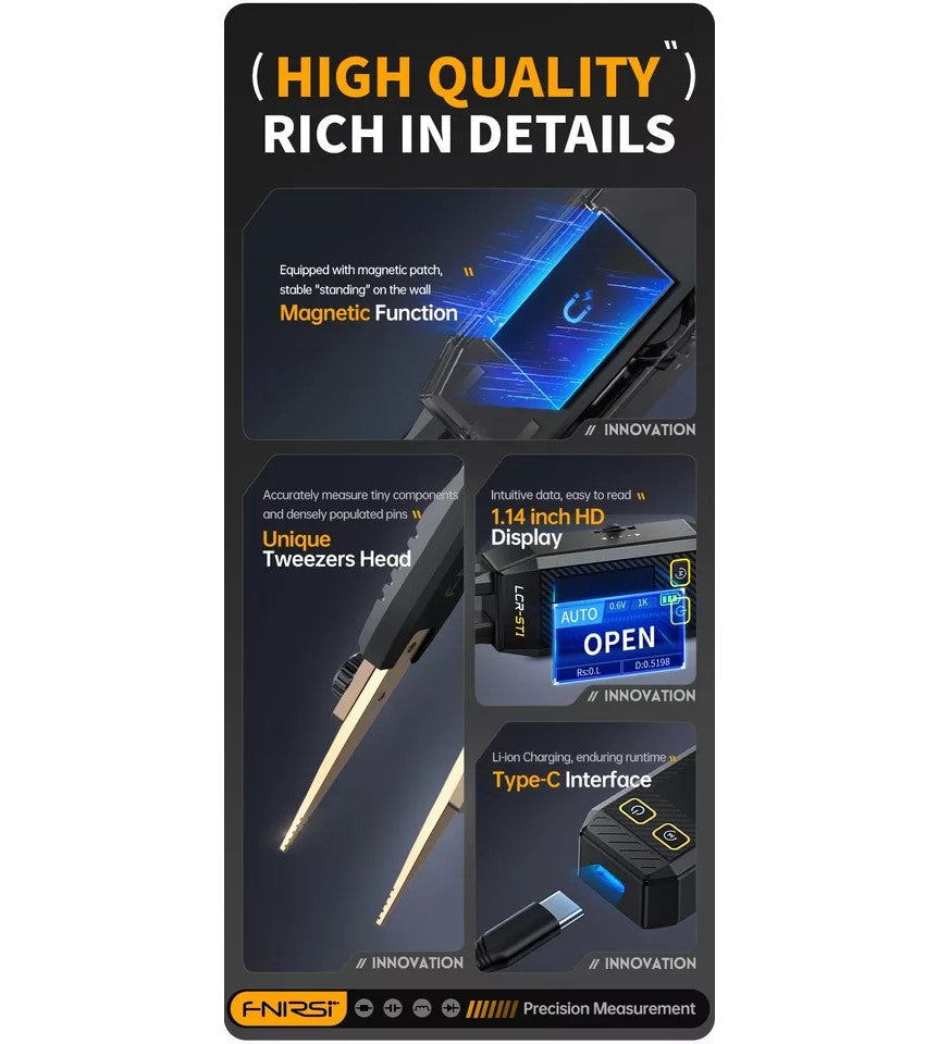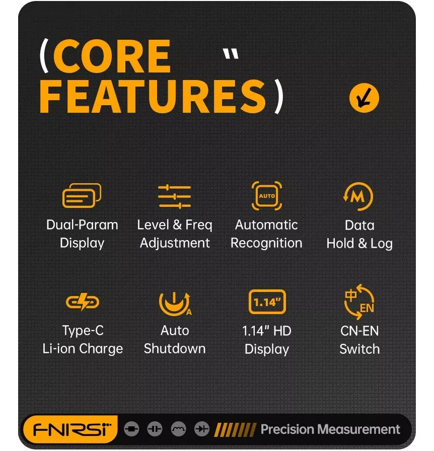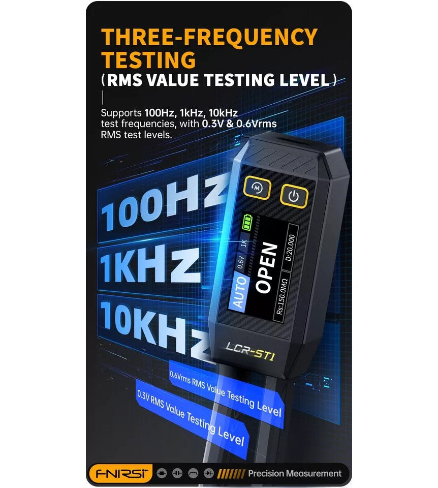 Dette produkt anvender avanceret måleteknologi for at sikre høj nøjagtighed og stabilitet. Dens 1,14 tommer farveskærm og magnetiske adsorptions funktion forbedrer bruger venligheden. Det indbyggede 250mAh lithium batteri giver en langvarig brugstid og understøtter tre frekvenser: 100Hz, 1kHz og 10kHz. med 0,3V, 0,6V RMS testniveauer