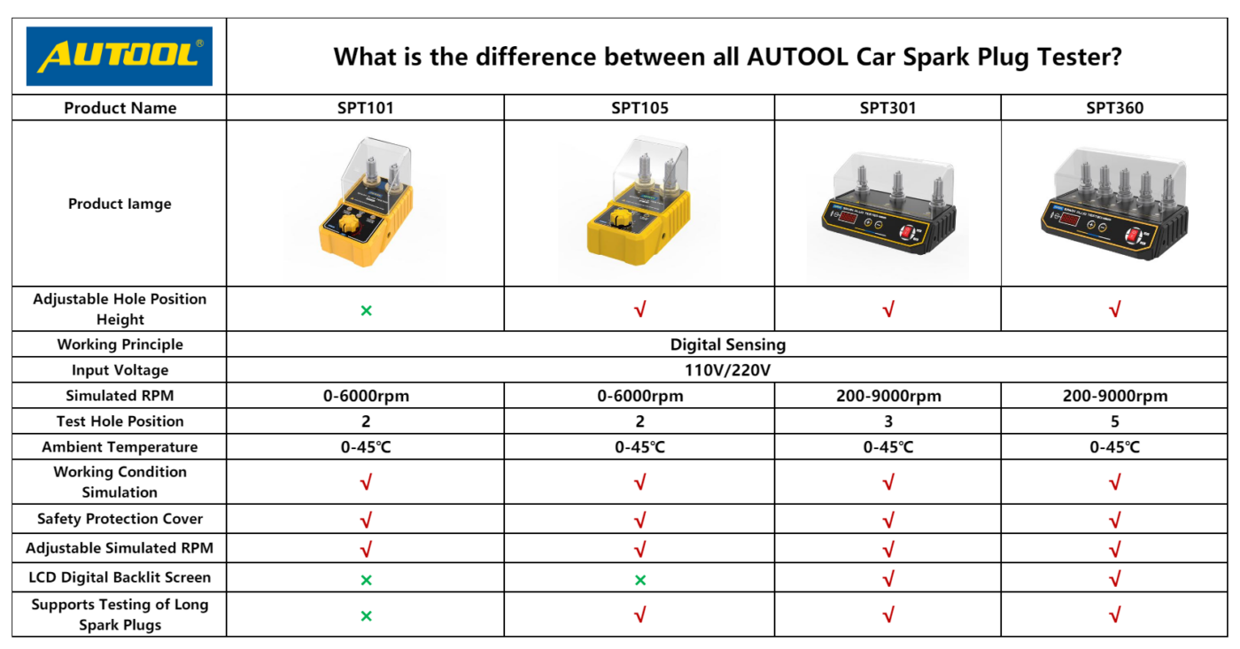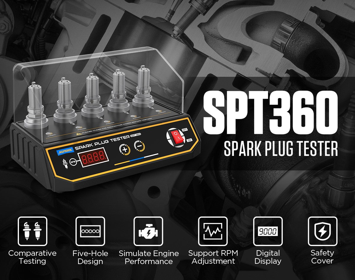 AUTOOL SPT360 er en digital tændrørs højfrekvens tester med en maksimal hastighed på 9000 rpm. Den er kompatibel med alle krumtapakselmotorer og motorcykler og kan teste op til fem tændrør samtidigt.